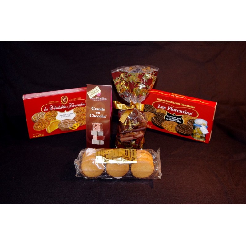 Ingrédients : florentins orange-noir (24% chocolat noir (pâte de cacao 45%, sucre, beurre de cacao, émulsifiant : lécithine de soja), sucre, 16% cubes d’oranges confites (écorces d’oranges, saccharose, sirop de glucose, sucre, acidifiant : acide citrique), 13% amandes effilées, beurre demi-sel frais (lait), 8% raisins secs, crème fraîche (lait), 6% miel) –Granit : Chocolats (sucre, beurre de cacao, pâte de cacao, lait, lécithine de soja, vanilline), sucre, amandes, noisettes, noix, raisins, écorces d’oranges confites, colorant E124 et E132) – chocolats assortis : (pâte de cacao, sucre, beurre de cacao, crème, poudre de lait, amande, noisette, beurre frais (lait), pistache, miel, sirop de glucose, noix, raisin, Thé noir, mandarine, poire, abricot, orange, citron, sucre inverti, beurre concentré, kirsch, extrait café, extrait pistache, cognac, pétales de fleur, rhum, poudre de lait entier, matière grasse laitière anhydre, eau, fécule, huile végétale, blanc d’œuf, arôme naturel de vanille , céréales (farine de riz, gluten de blé, malt de blé), colorant (E171 / E172 /E153), vanille Bourbon en gousse, Fleurs Naturelles de Lilas, sucre du lait, protéines de lait, sel, extrait de malt (orge) , sel, dextrose, lécithine de soja, Agent enrobage (gomme arabique, shellac, Gomme d’Acacia), Colorants: E120-E132- e555-e172, agent texturant :sorbitol-glycerol, grains de café, acidifiant : acide citrique, gélifiant pectine, arôme naturel de mandarine, arôme naturel vanille, poudre à lever:E500ii,arômes(rhubarbe, fraise des bois, fraise), arômes) – Galettes fines choc lait : Chocolat lait 36% (sucre, beurre de cacao, poudre de lait, pâte de cacao, lécithine de soja), farine de froment, beurre frais, sucre, oeufs entiers frais, sel, fleur de sel de Guérande, poudre à lever : bicarbonate de soude – Pétales de crêpes : Farine de sarrasin de Bretagne, beurre frais, sucre, oeufs entiers frais, fleur de sel de Guérande.