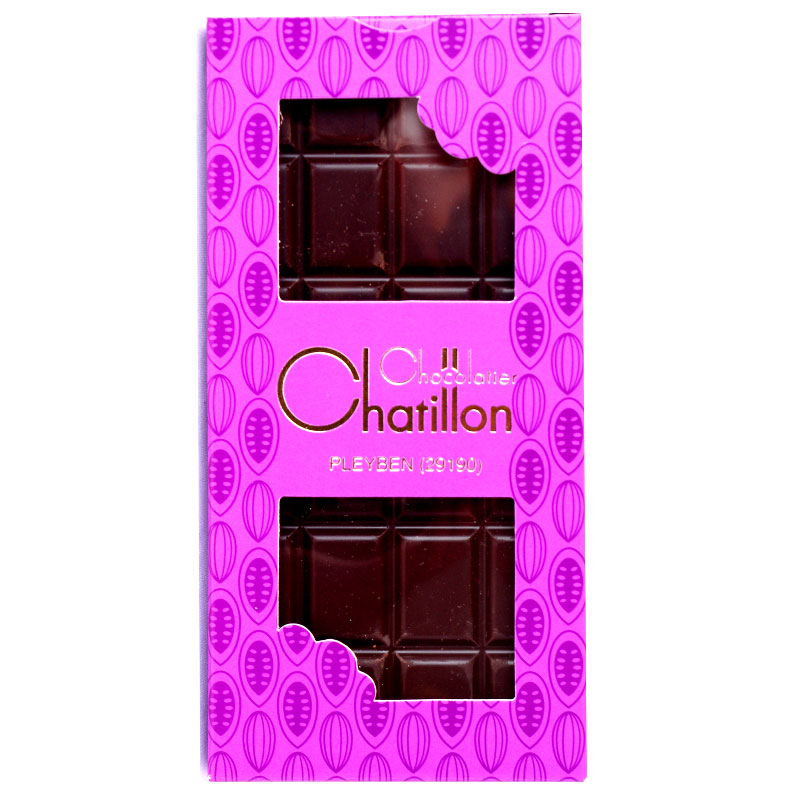 Ingrédients : 72% de cacao min (fève (Togo), sucre, beurre de cacao, émulsifiant : lécithine de tournesol). Peut contenir des traces de lait et de fruits à coques.